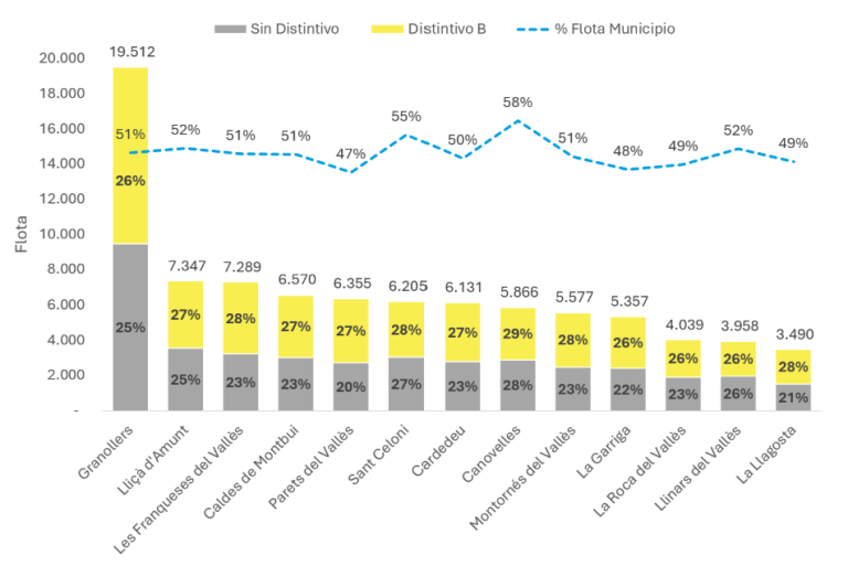 En estos municipios, incluyendo Granollers, hay 171.623 vehículos particulares entre turismos, motocicletas, furgonetas y ciclomotores. De ellos, 41.053 vehículos (24%) no tienen distintivo ambiental y 46.643 vehículos (27%) llevan etiqueta B. En total, 87.696 vehículos, es decir, el 51% de la flota, estarán afectados por las restricciones de la ZBE.